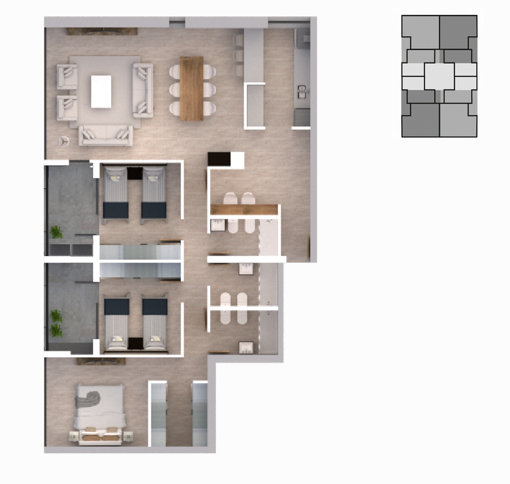 Departamento 3 dormitorios. Opción A Superficie 148 m2 aprox. Las imágenes y superficies son meramente ilustrativas, aproximadas y orientativas; y están sujetos a cambios.